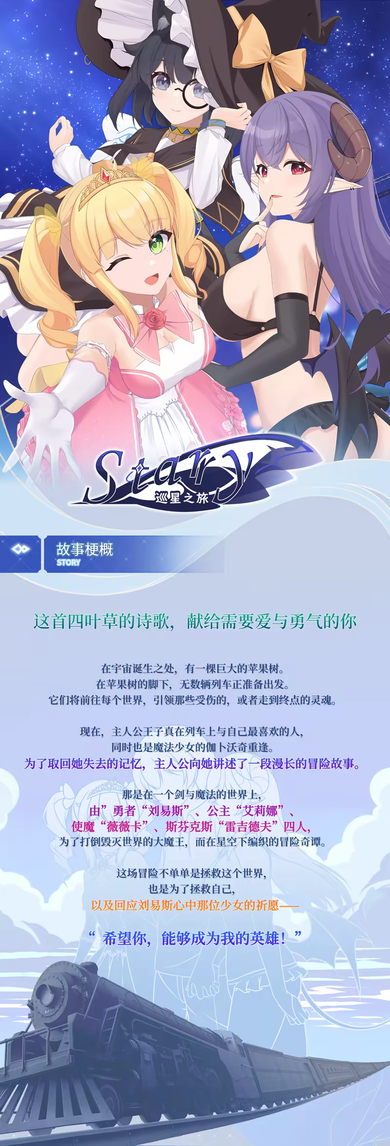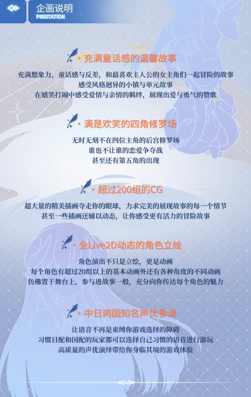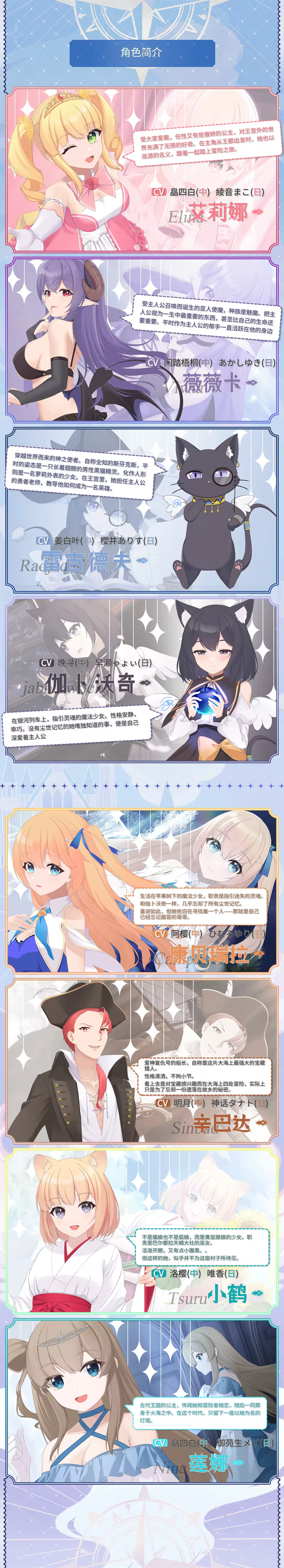 为了打倒毁灭世界的大魔王,少年和少女们踏上长长的旅途,开启了一段跨越两个世界的恋爱、幻想奇谭。 本作品搭载了中日语的文本和配音,L2D动态立绘以及超过200张的基本CG;此外还有立绘触碰等独特系统。