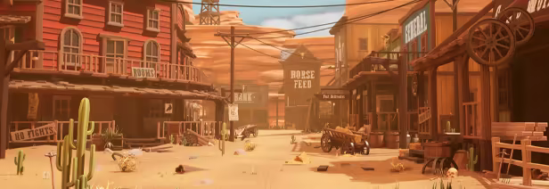 • A western town called Silent West, with old houses/shops and dusty streets.