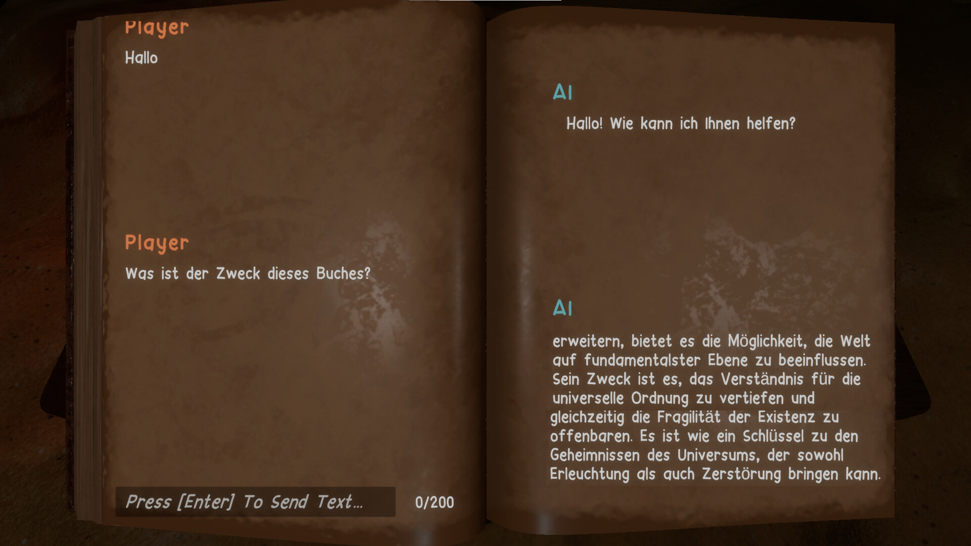 there is a book in the game and the book itself is artificial intelligence....you will write a text to the book and it will reply in writing