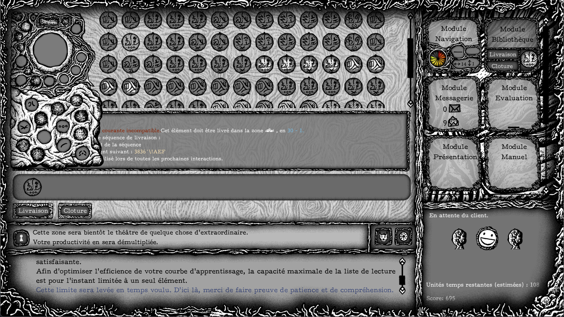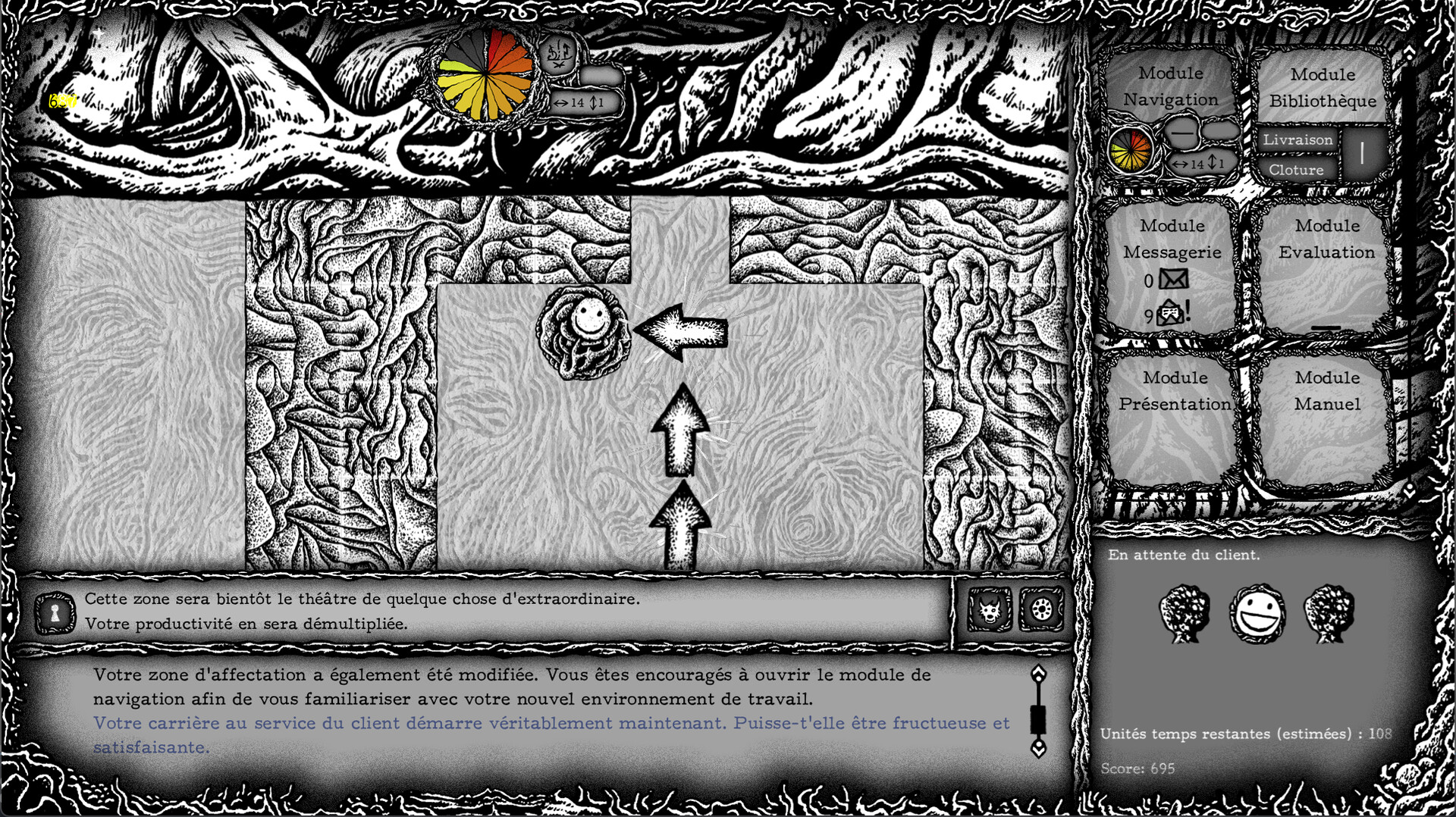 Bonjour Nouvel_Employé. Votre tâche au sein de la Compagnie : servir le Client. Suivez les consignes, tissez des relations productives avec vos collègues, exécutez les désirs du Client, et qui sait, le titre d'Employé de la Semaine, voire du Mois, finira par être à votre portée.
