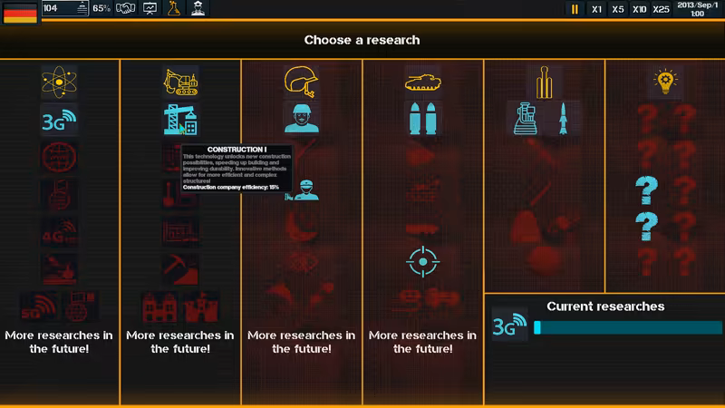 • Use the budget menu to edit expenses and efficiency in various sectors of the country, such as construction, research, army, and administration. Hire additional construction companies to speed up building! Don’t forget about taxes as well!