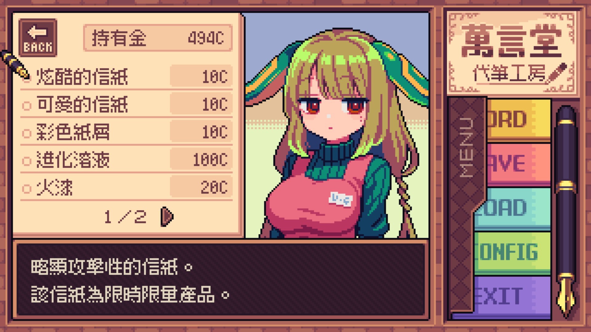 遊戲內容將得到大幅度的進化,在原本的免費版「萬言堂代筆工房」基礎上新增4個章節!第二章以後可以通過全新的「漫步環節」在城市裡尋找符合委託人期望的詞語。傾聽多達11名角色的話語,收集適合加入輪盤的單字,從而將原本就沒眼看的書信糟蹋得更加不堪入目吧!