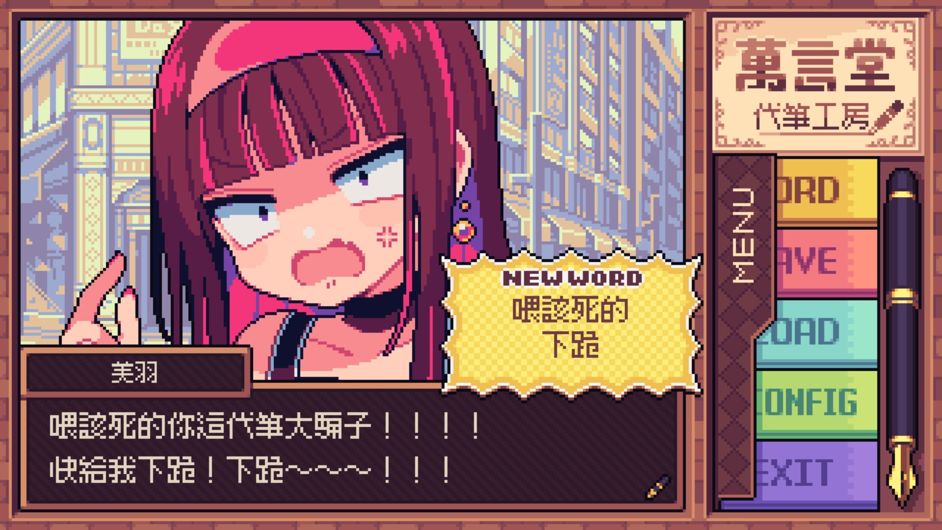 遊戲內容將得到大幅度的進化,在原本的免費版「萬言堂代筆工房」基礎上新增4個章節!第二章以後可以通過全新的「漫步環節」在城市裡尋找符合委託人期望的詞語。傾聽多達11名角色的話語,收集適合加入輪盤的單字,從而將原本就沒眼看的書信糟蹋得更加不堪入目吧!