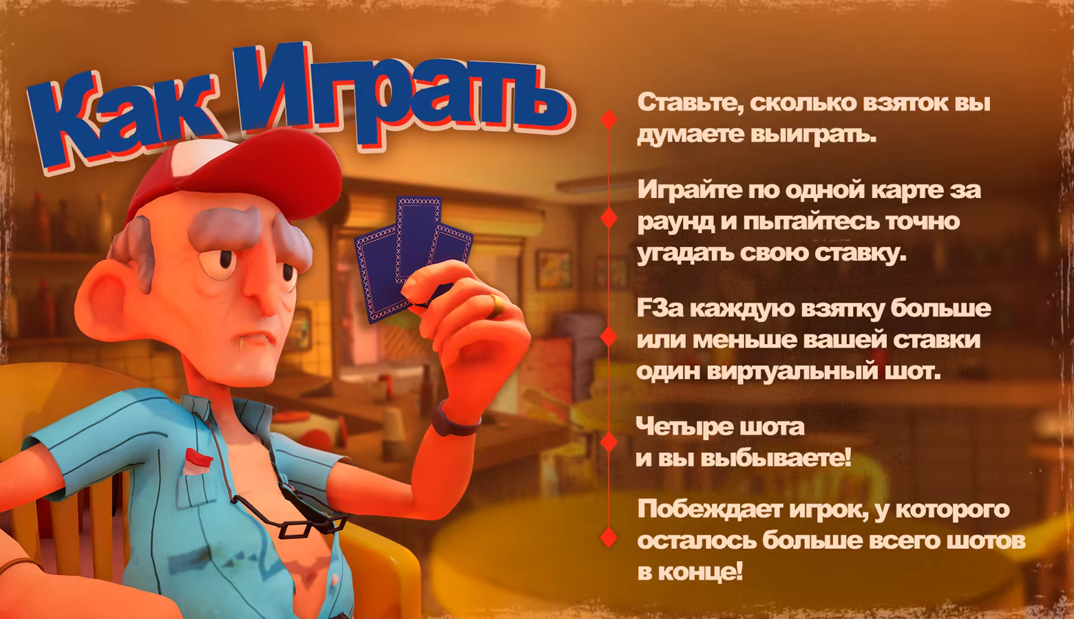 Игроки делают ставку на количество взяток, которые они думают выиграть, и затем разыгрывают карты раунд за раундом, стараясь угадать точно. Если ты возьмёшь больше или меньше, чем поставил, получишь виртуальный «шот» за каждое расхождение. Четыре шота — и… ты выбыл. Капот!