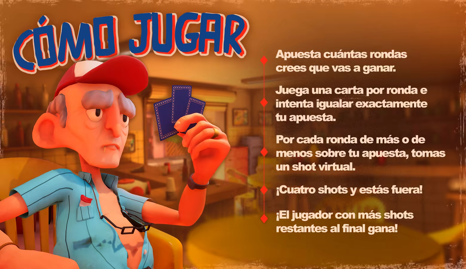Los jugadores apuestan cuántas bazas creen que ganarán, luego juegan sus cartas ronda a ronda para acertar ese número exactamente. Si ganas más o menos de lo apostado, tomarás un “shot” virtual por cada diferencia. Con cuatro shots… estás fuera. ¡Capotado!