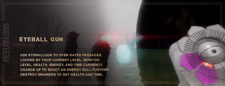 Returnless is a roguelite, metroidvania-inspired platformer with combat. Collect mystical tripods to upgrade your eyeball gun and unlock new pathways in future runs. Escape an unstoppable fog. No checkpoints, and progression is saved only after completing a full run.