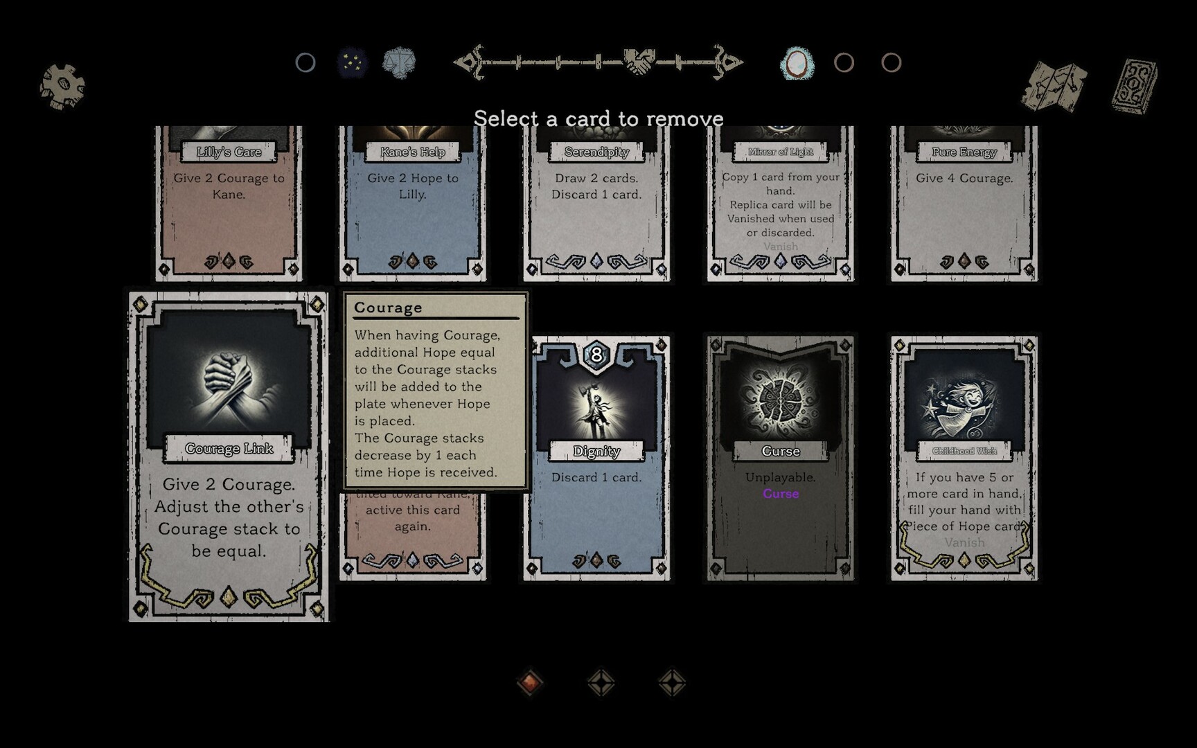Assigning cards to the twins adds hope to each side of the scale. If the difference in their hope grows too large, the scale will tip, and its balance will begin to falter. When the scale tips completely and balance cannot be restored, its health decreases. Additionally, failing to accumulate enough hope to surpass the set despair value for each trial also reduces the scale’s health. If the scale’s health is fully depleted, the journey can no longer continue.