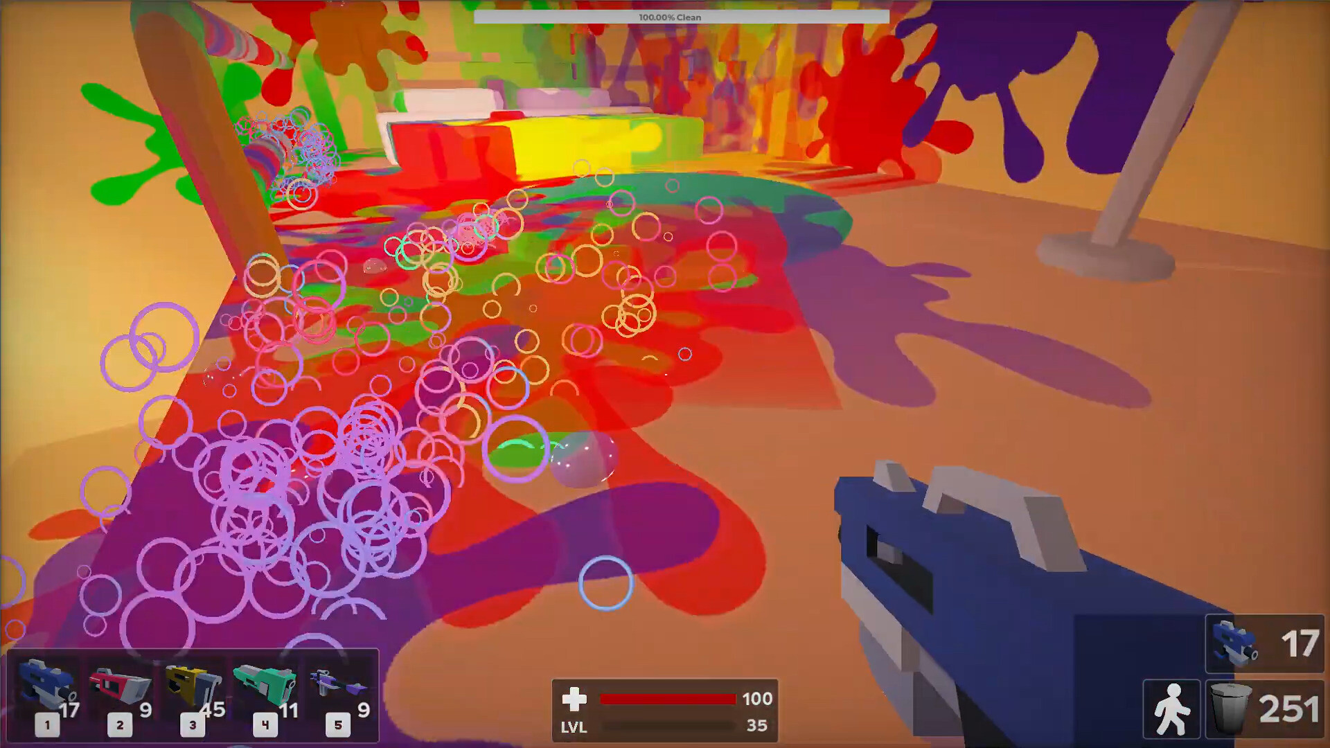 Your journey begins with the Bluegun, a powerful cleaning tool designed to scrub away filth and obliterate junk. Fire bubbles to wash walls, furniture, and floors, or shatter clutter into satisfying particles. Every cleaning action earns experience points, allowing you to unlock upgrades that make your tools even more effective.