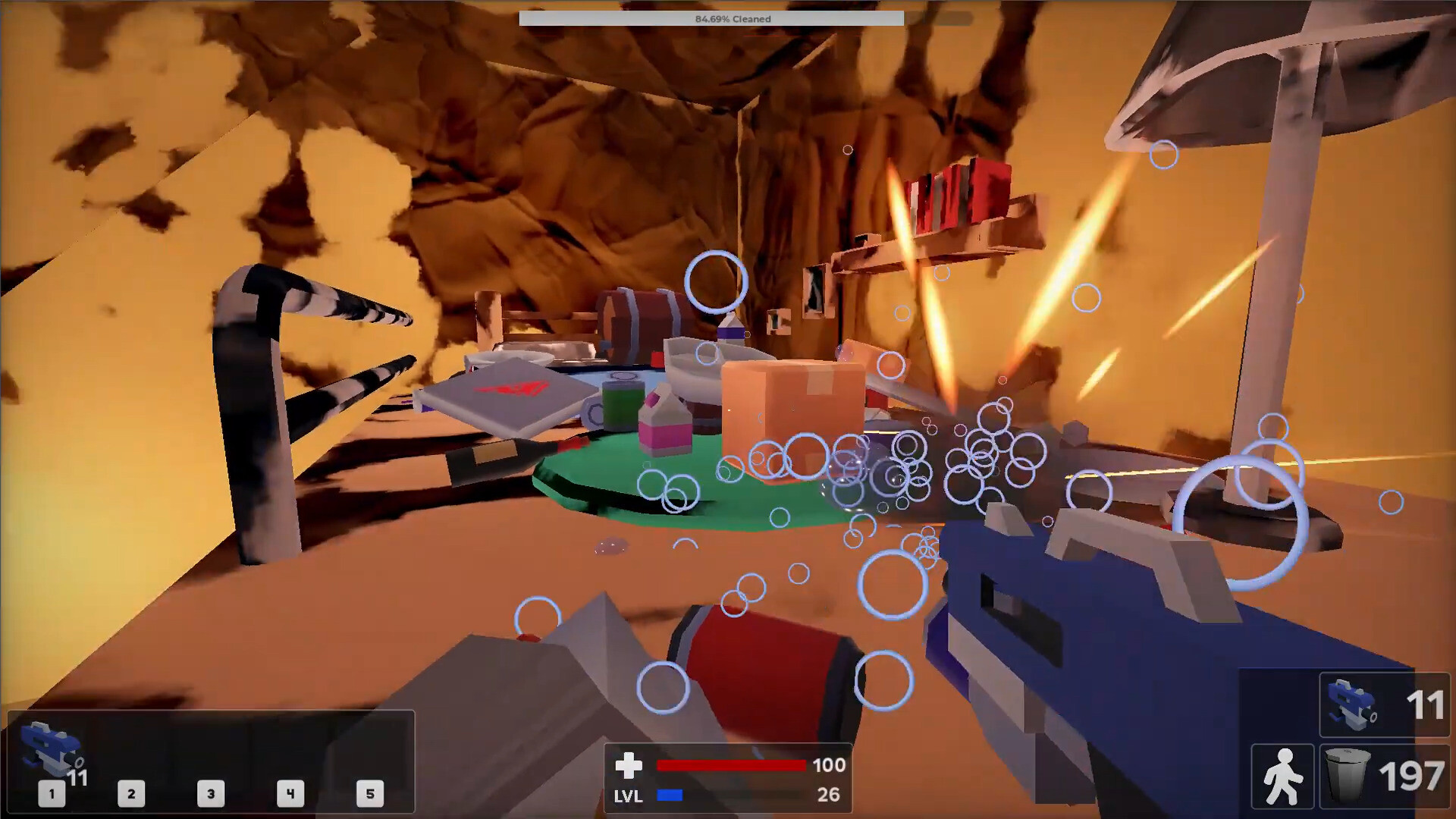 Your journey begins with the Bluegun, a powerful cleaning tool designed to scrub away filth and obliterate junk. Fire bubbles to wash walls, furniture, and floors, or shatter clutter into satisfying particles. Every cleaning action earns experience points, allowing you to unlock upgrades that make your tools even more effective.