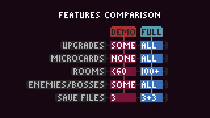 This is the Demo version of Microvania.  It is a standalone experience, that is set in a separate world from the base game.  It can be completed in a single session, though it may take a little longer to find all the secrets.