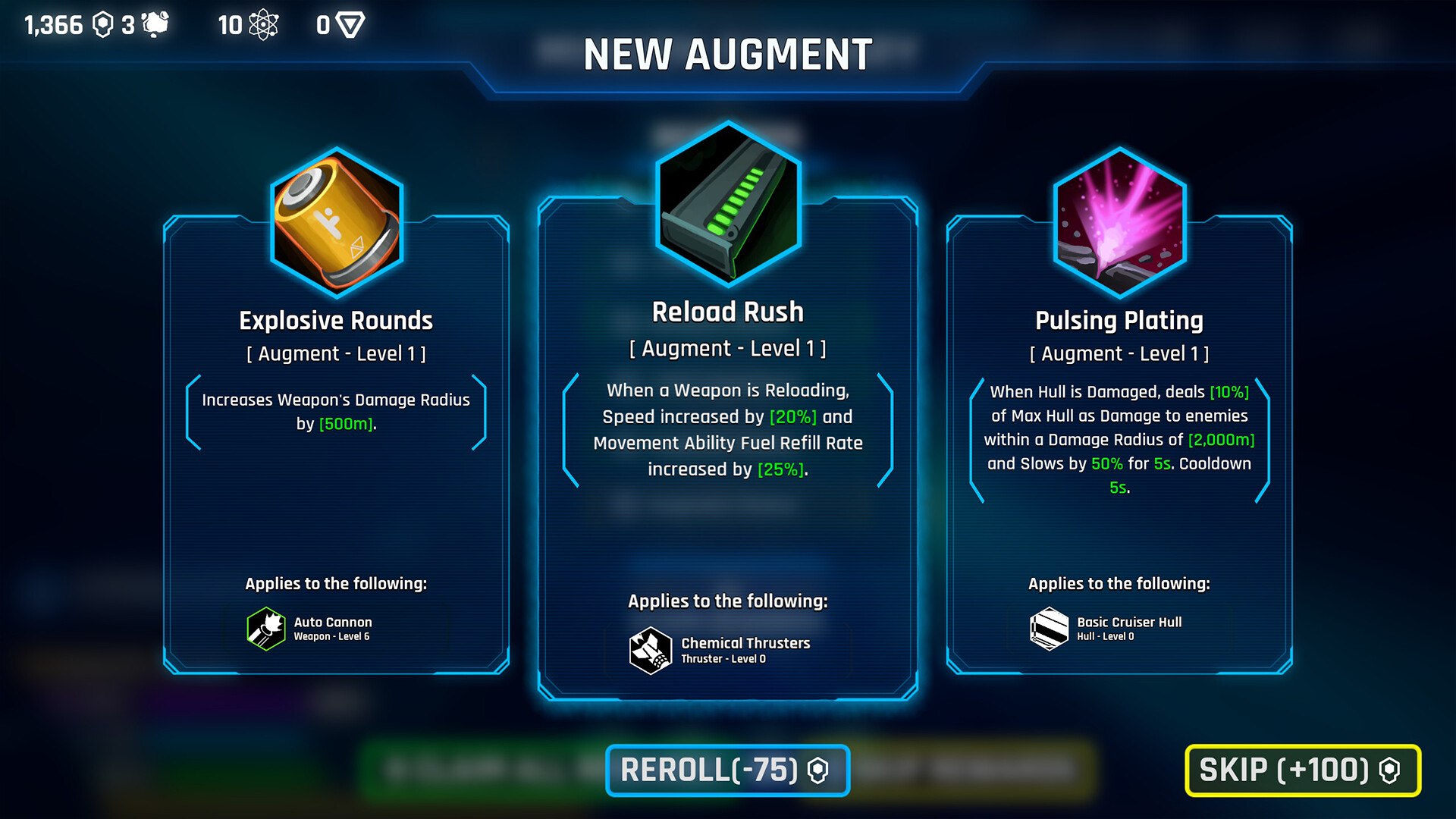 Transform your hull with augments like Pulsing Plating, enabling your ship to release a forceful burst of energy when sustaining damage, or deploy Proximity Mines to eliminate pursuing fighters.