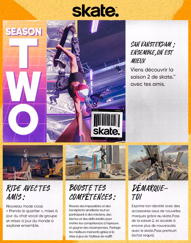 « La grande zone urbaine en monde ouvert de skate. est une destination dédiée au skateboard qui offre une progression multiplateforme avec 150 joueurs et joueuses par serveur. Vous pouvez jouer avec vos potes pour trouver des spots à chaque coin de rue [beaucoup se trouvent dans des endroits inattendus]. Le jeu propose des missions, des défis de développement de compétences et des événements saisonniers en direct. Vous disposez de nombreuses options pour personnaliser votre personnage et vos planches de skateboard, notamment des partenariats avec des marques réelles.
