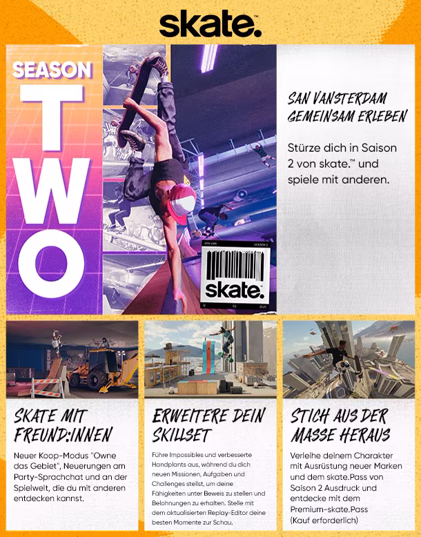 „Die große, offene Stadtwelt von skate. ist ganz dem Skateboarden gewidmet und ein Ort an dem sich 150 Skater pro Server versammeln und plattformübergreifend Fortschritt erzielen können. Spielt mit Freund:innen, um Skateboarding-Spots an jeder Ecke (und an vielen unerwarteten Orten) zu entdecken. Das Spiel hat Missionen, herausfordernde Challenges und saisonale Live-Events. Euch stehen jede Menge Anpassungsmöglichkeiten für euren Charakter und eure Decks zur Verfügung, darunter auch Brand Collaborations mit aufregenden Marken aus der echten Welt.