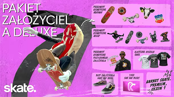 „Rozległe, otwarte miasto gry skate. to wymarzony cel dla deskorolkowców. 150 graczy na serwer, rozgrywka międzyplatformowa, współdzielone postępy… Możesz grać ze znajomymi i znajdować zakamarki do jazdy za każdym rogiem (często w nieoczekiwanych miejscach). W grze są misje, wyzwania rozwijające twoje zdolności i wydarzenia sezonowe. Nie zabraknie opcji dostosowania wyglądu postaci i jej deski, w tym współprac z ekscytującymi, prawdziwymi markami.