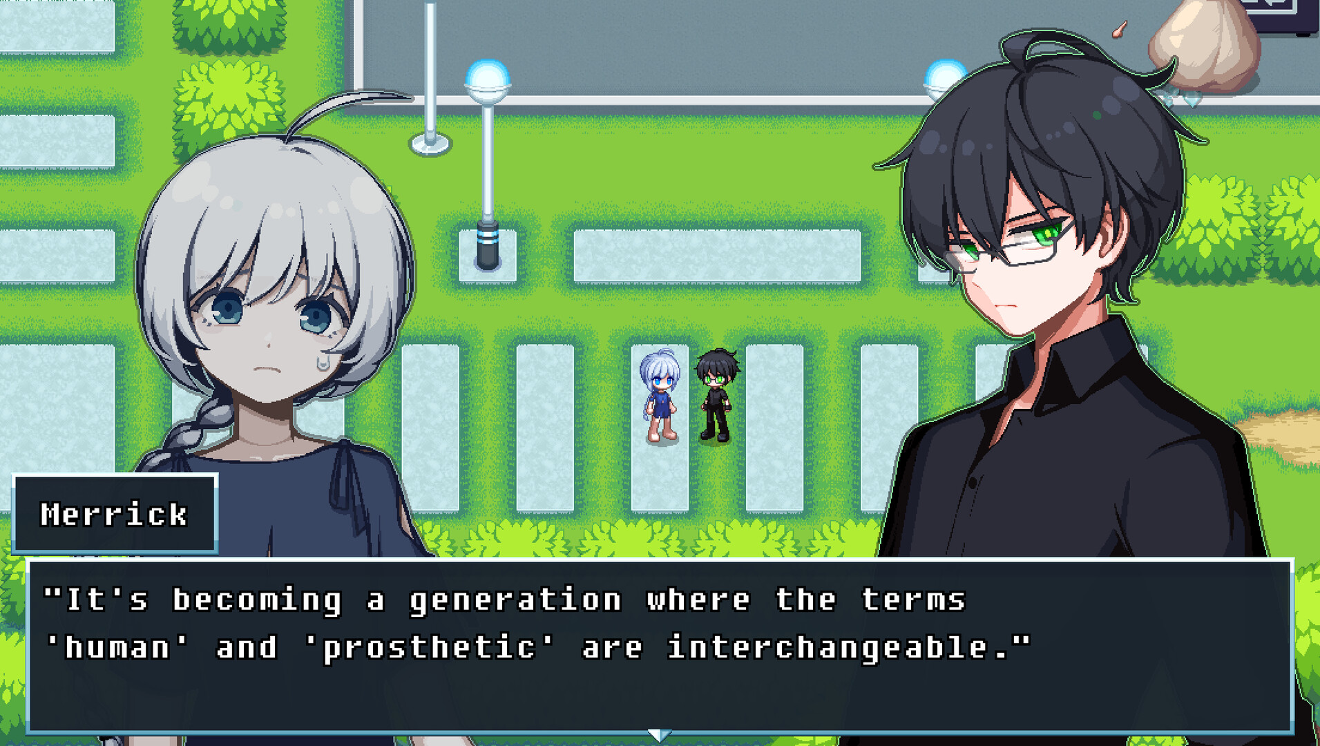 A purist who values humanity above all else. Merrick is kind to humans and hybrids, but cold and dismissive toward robots and prosthetic humans. He believes there is no need to show courtesy to them, reserving his warmth only for those he considers truly human.