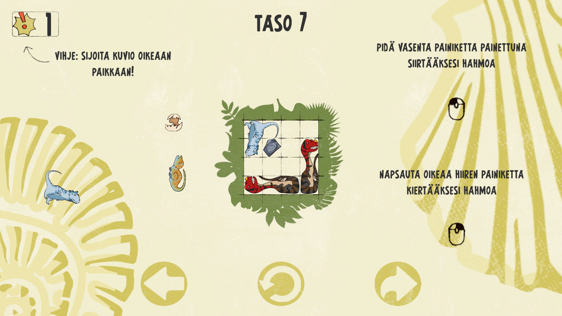 Hallitse dinosaurusten hahmoja helposti hiiren vasemmalla ja oikealla painikkeella. Siirrä ja kierrä dinosauruksia sijoittaaksesi ne täydellisesti ruudukkoon.