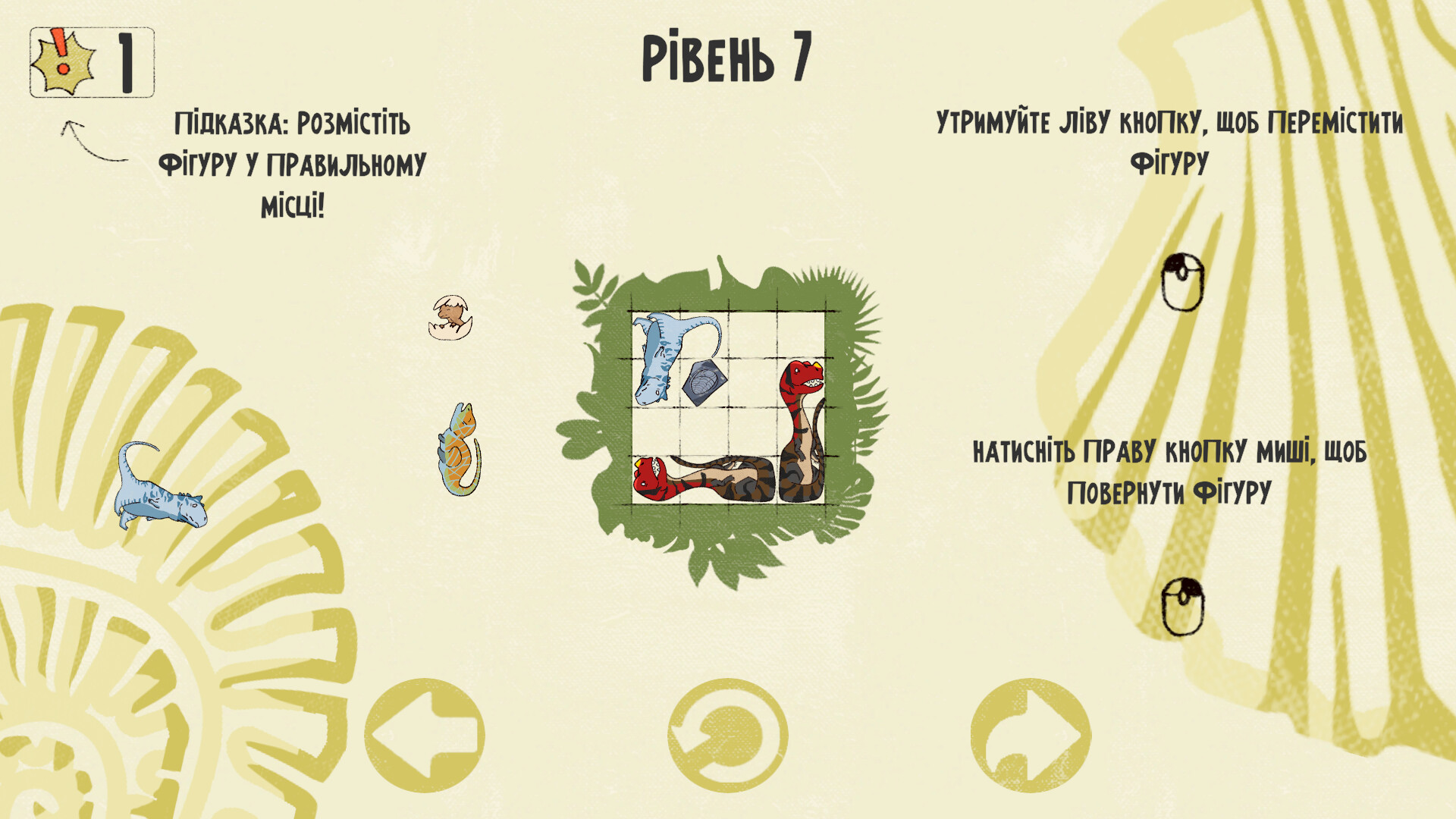 Легко керуйте фігурками динозаврів за допомогою лівої та правої кнопок миші. Переміщуйте та повертайте динозаврів, щоб ідеально розмістити їх на сітці.