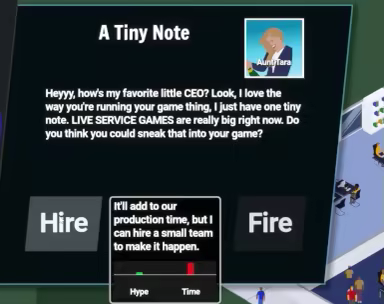 "The Board" of Frelgium Water Co. has just acquired a AAA gaming wing under the direction of your aunt Tara, and your dad thinks this is a good opportunity for you to "gain some valuable experience." Your first day as a game studio CEO starts now.