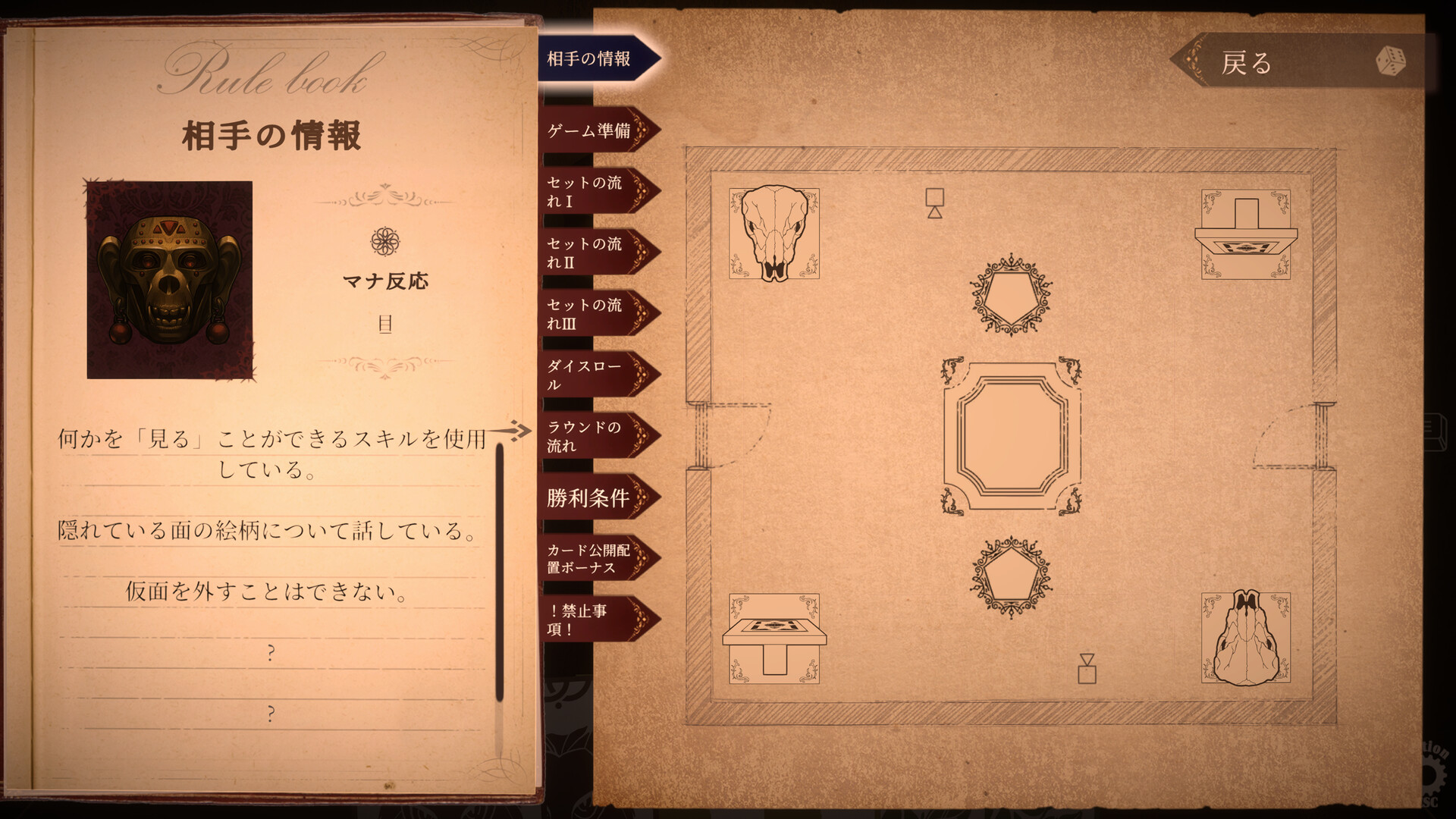 サイコロとカードを使ったDice Eaterゲームを進めながら、会話や調査を通じて敵の情報を集め、調査書を完成させましょう。相手を制圧できるだけの情報を集めたら、いよいよ推理の始まりです。