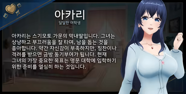 하지만 현실은 그리 간단하지 않습니다. 아카리의 시험까지 남은 시간은 단 30일. 당신은 체력과 시간을 효율적으로 관리하며, 그녀들의 일상 속에 숨겨진 비밀을 밝혀내야 합니다!