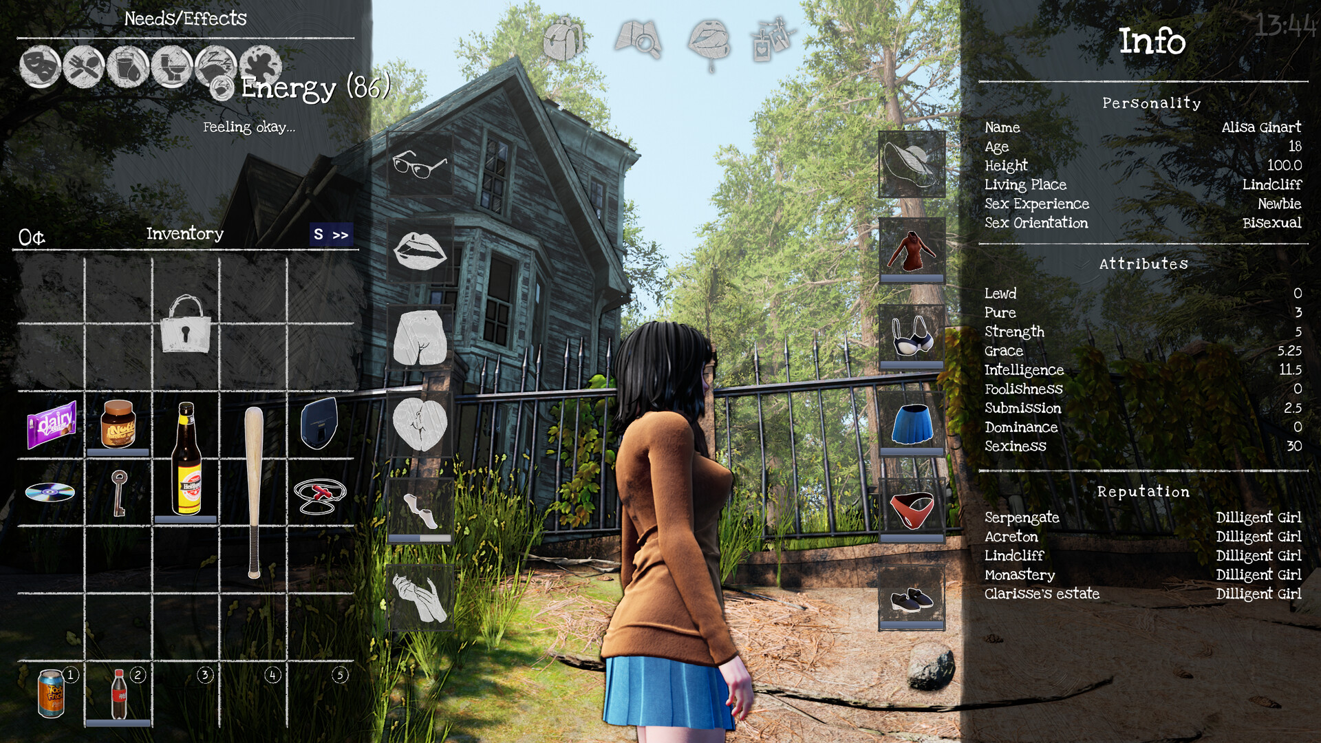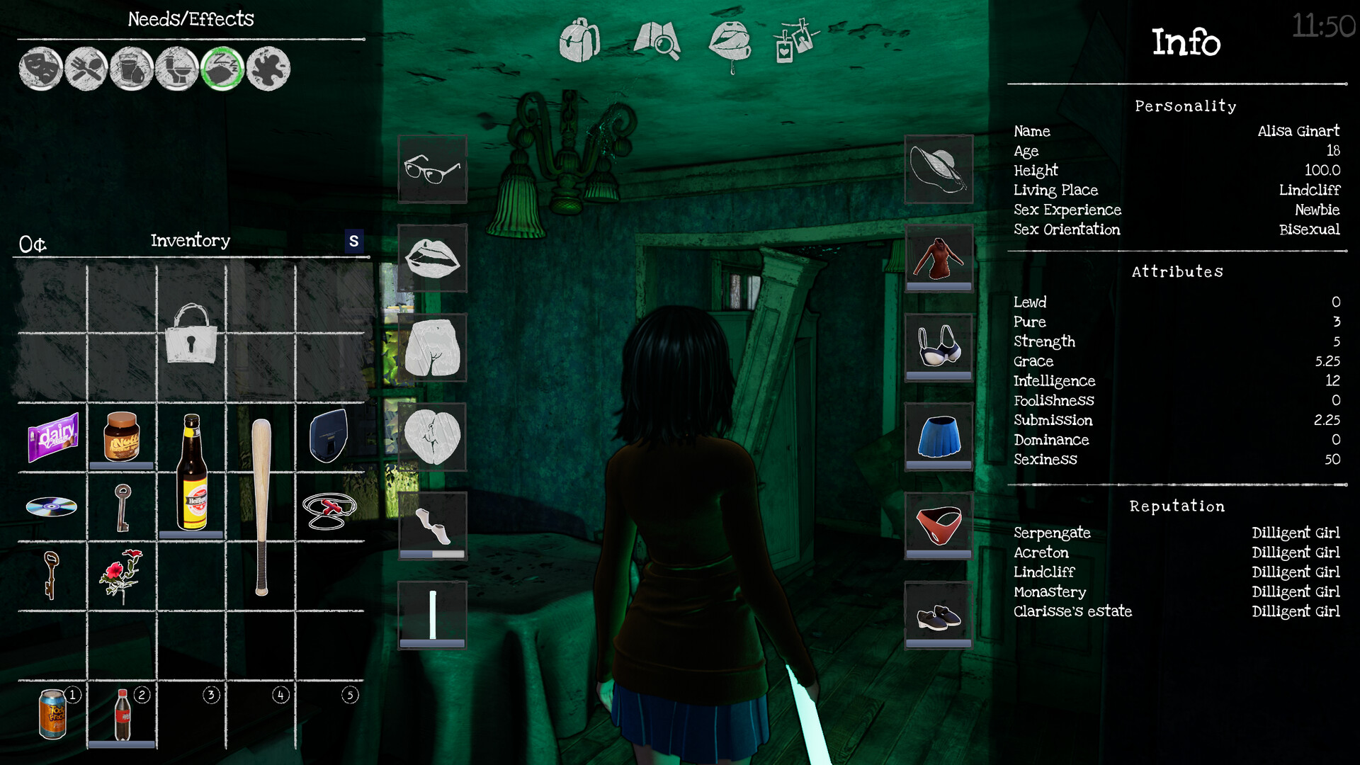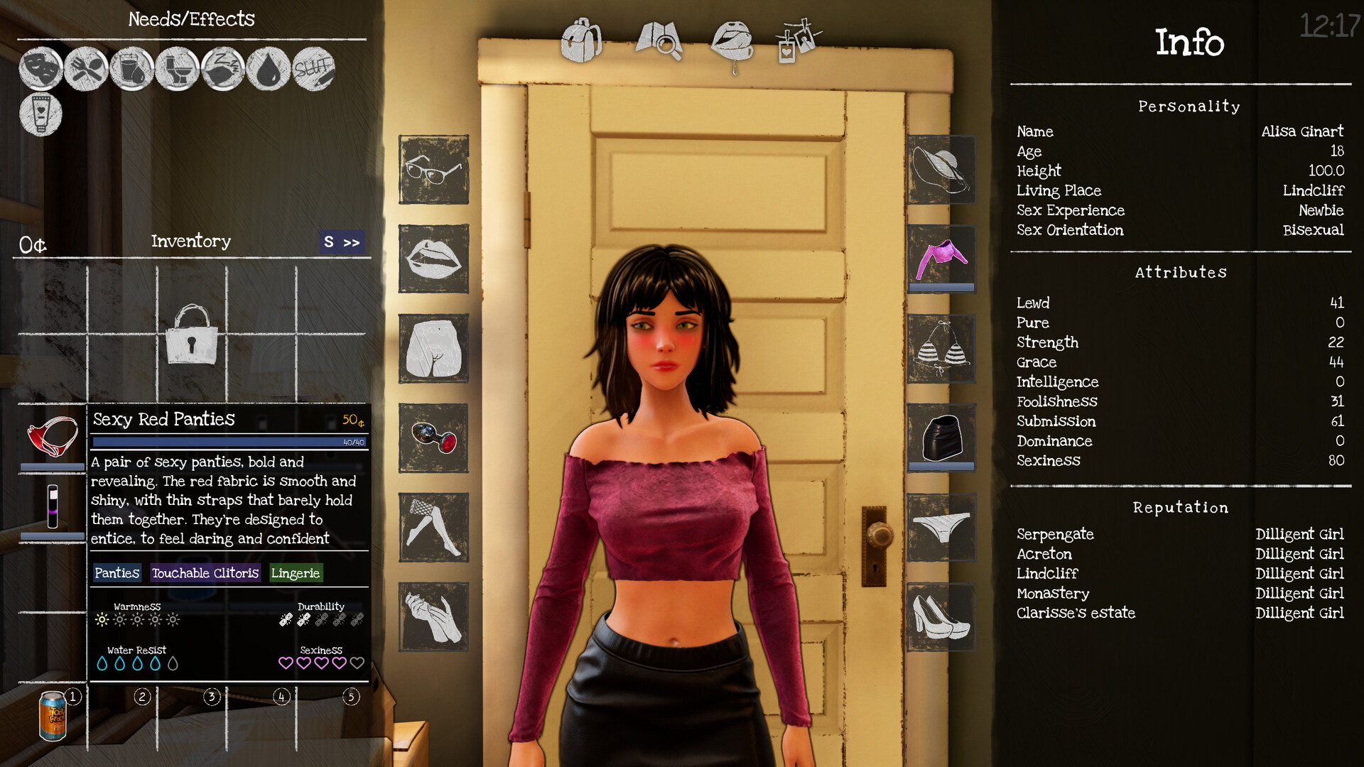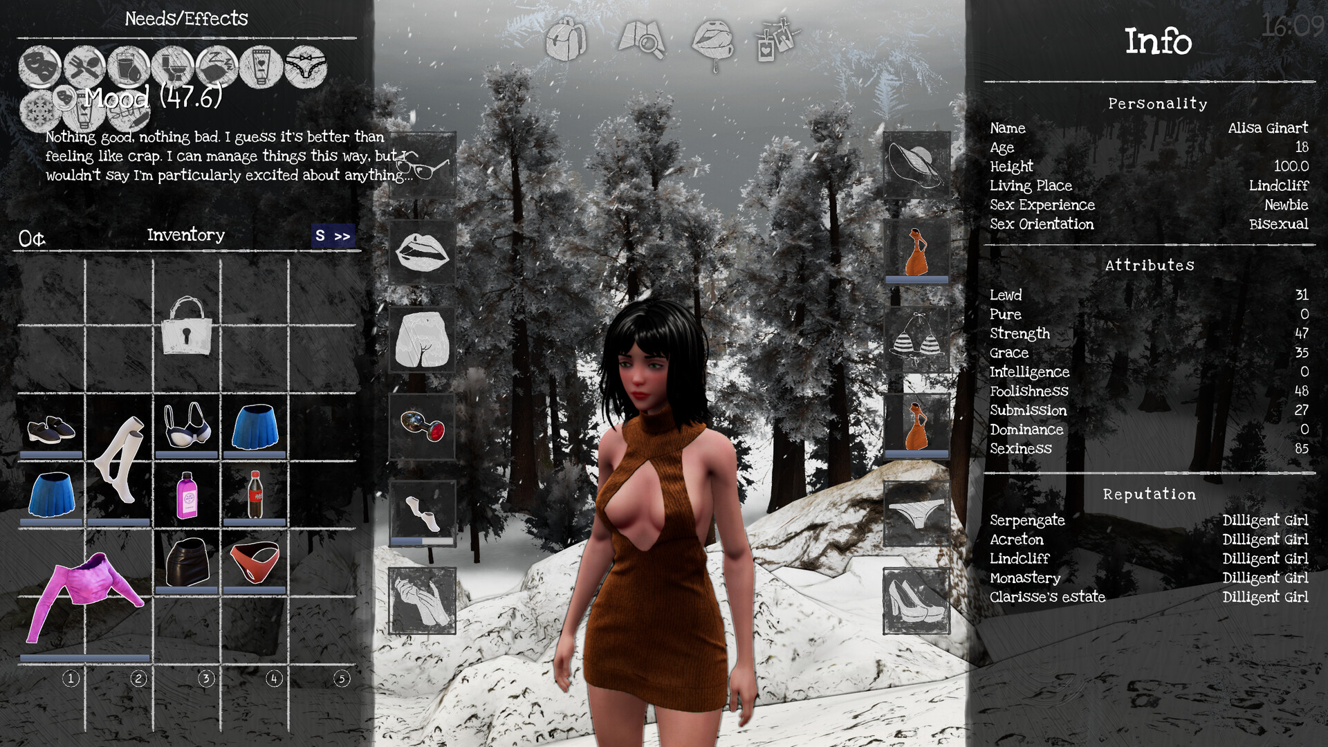 • Keep Alisa happy and satisfied as well as tending to her regular needs: energy, hunger, arousal and others.
