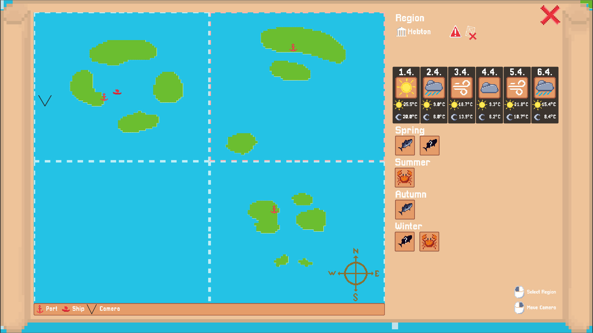 The harbour is the main hub for production management. Here, you can sell fish, set up production, buy new equipment, hire crew, and much more. You can also upgrade the harbour to improve its efficiency.
