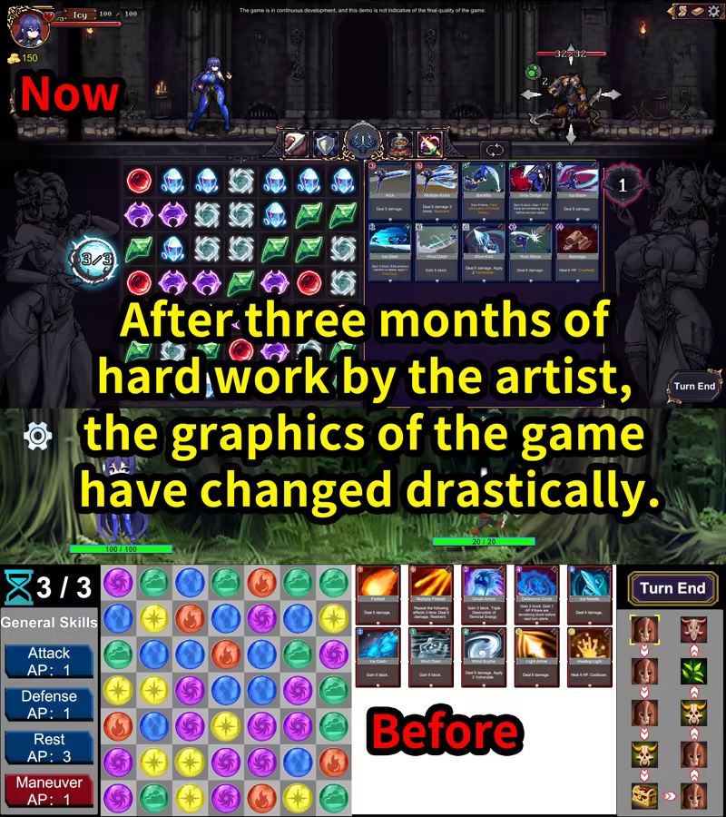 Update 2025/02/06: Updated all art assets. Turned the original skimpy animation into a stop-motion presentation similar to Dark Dungeon that make the skill shows with visual impact.