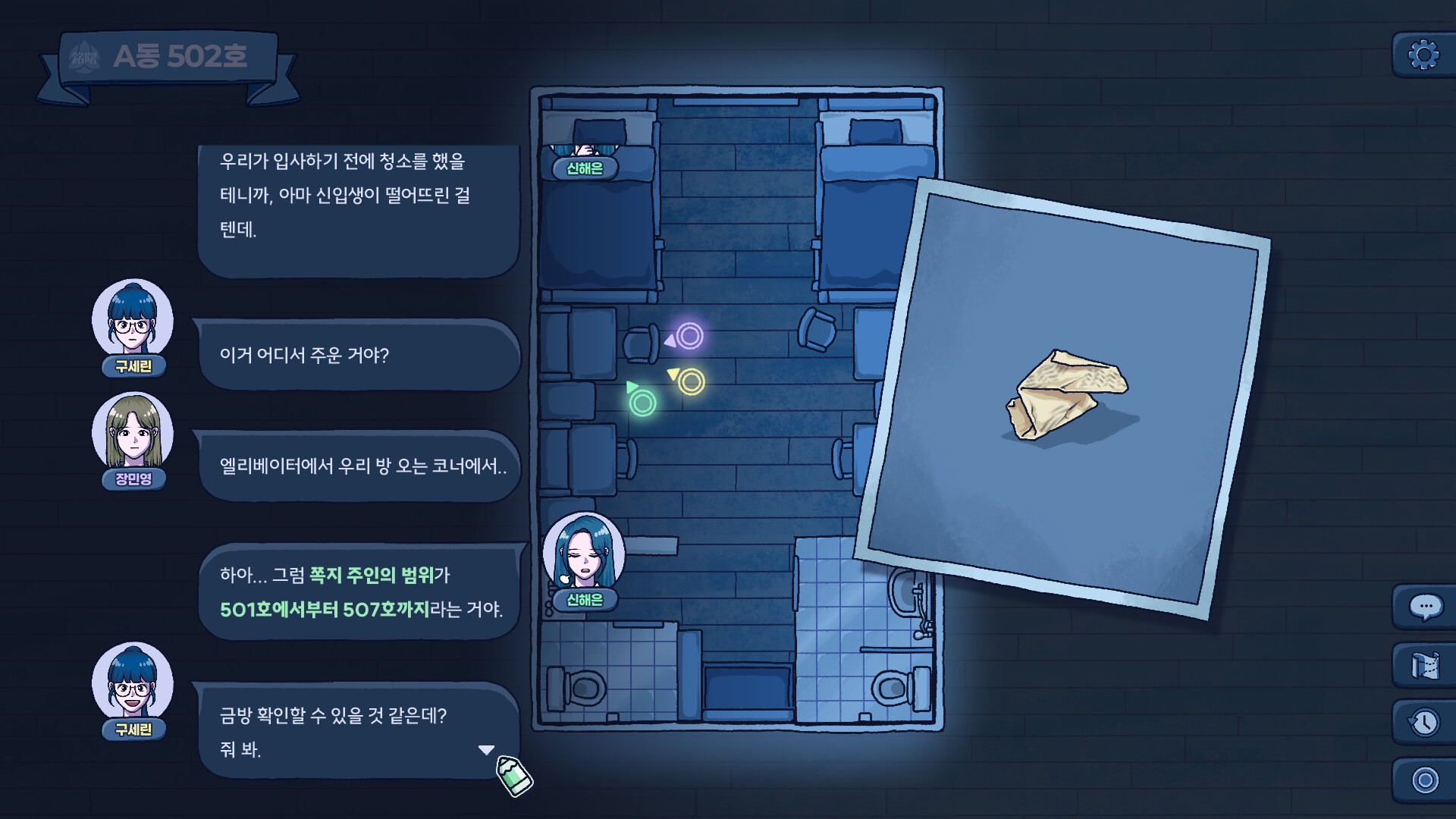 플레이어는 명서고등학교 곳곳을 돌아다니며 미스터리에 관련된 단서들을 수집해야 합니다.
