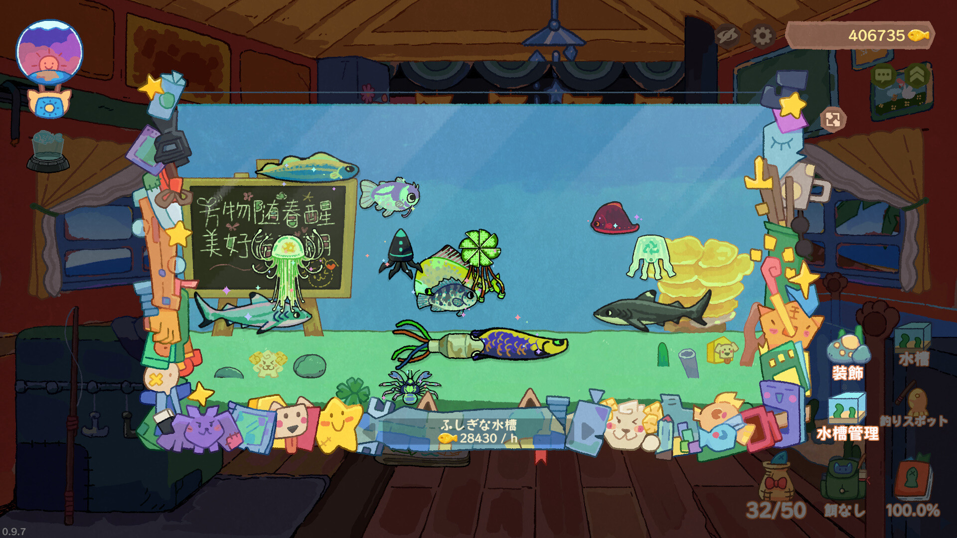 釣り上げた魚は、水槽に入れてじっくり眺めることができます。水槽はアップグレードして広くすることも可能。魚たちが優雅に泳ぐ姿に癒されながら、収益もゲット!