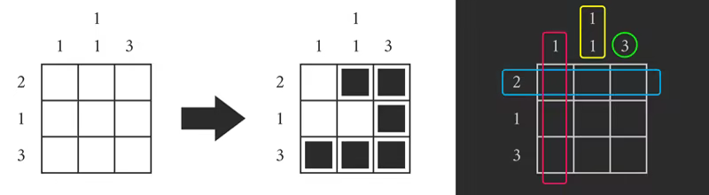 Here we have a basic 3x3 nonogram. On the left, we can see the nonogram's initial state, an empty grid. To the right of it we have its solution. The grid has been filled using the numbers shown alongside the edges of each row and column. How does one go about solving a nonogram? Let me explain using the nonogram on the right with the highlighted areas.