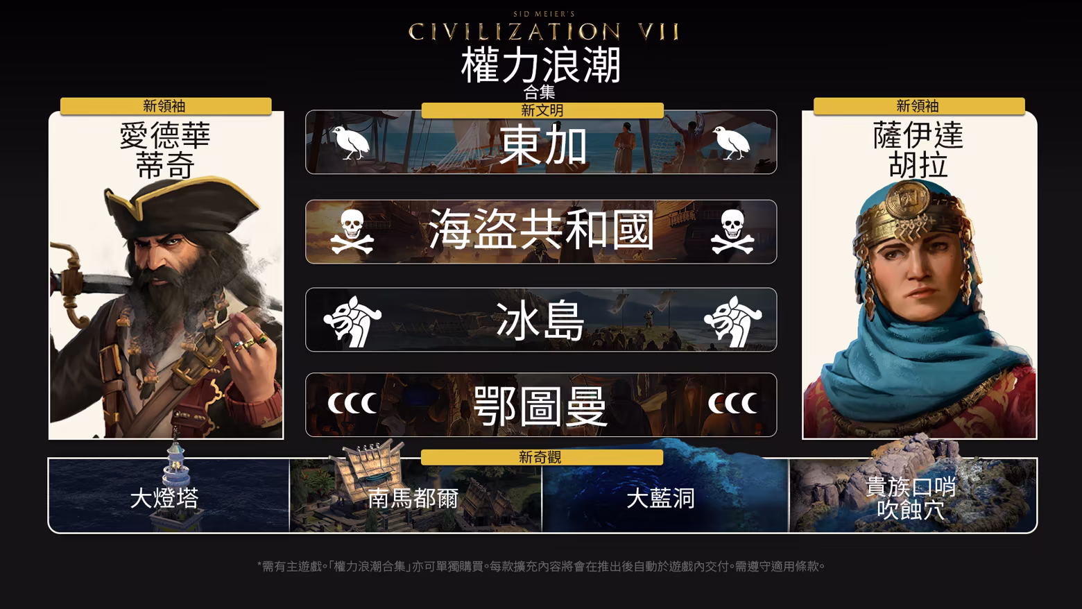 「權力浪潮合集」帶來遊戲發售後付費追加內容,為你統治下的帝國開啟全新可能性!化身為兩位新領袖:愛德華‧蒂奇與薩伊達‧胡拉。帶領四個新文明:海盜共和國、東加、鄂圖曼與冰島。發現壯觀的四個新奇觀:大燈塔、南馬都爾、大藍洞與貴族口哨吹蝕穴。