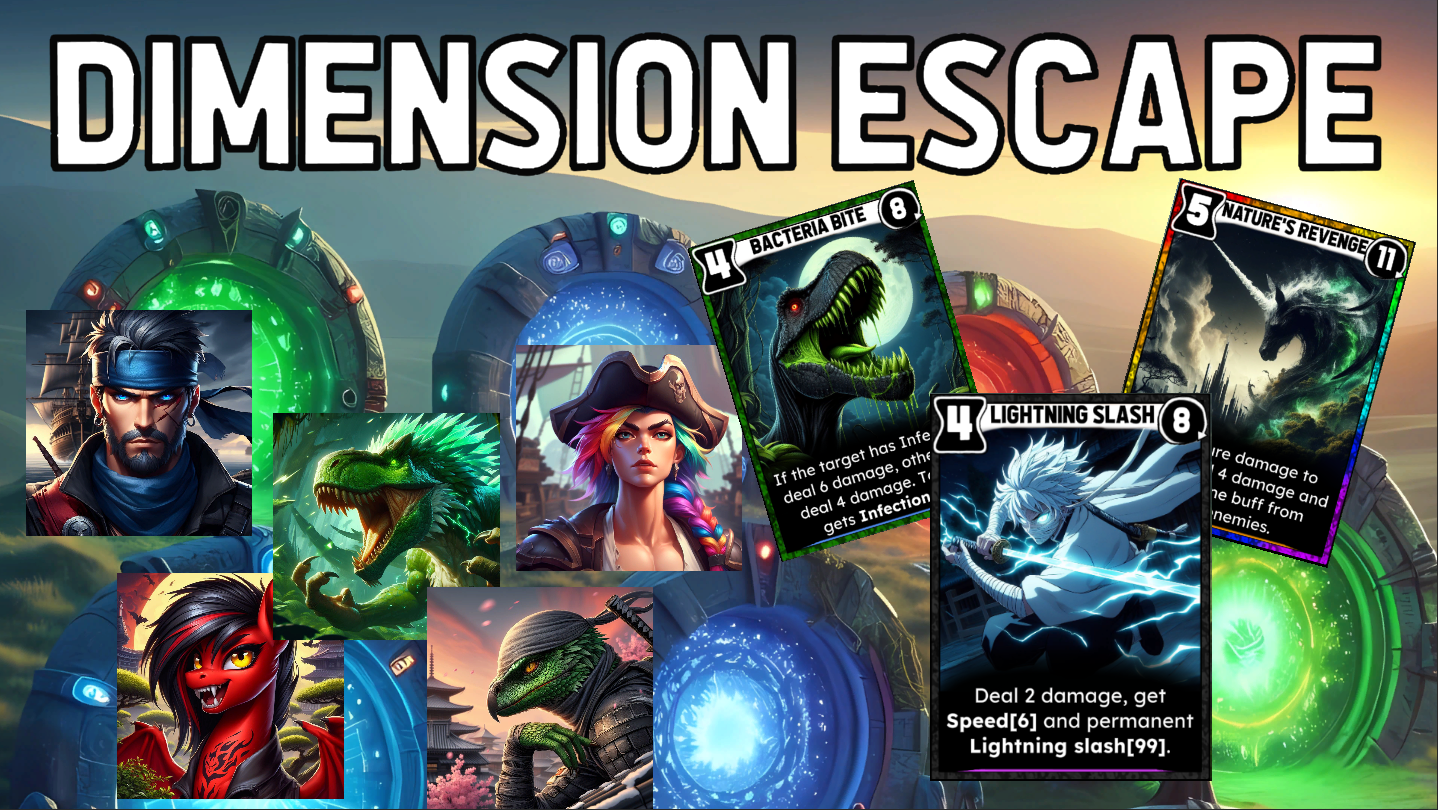 Dimension Escape is a tactical card game where every decision counts. Choose your heroes wisely—will you pick a ninja pirate or a robo dinosaur? Equip them with powerful ability cards and defeat all who stand in your way.