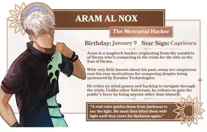 “Somnium Eleven” is an anime, choice-driven magitech otome simulation game where you can bond and interact with fellow competitors and four romance-able characters to unlock private messages, social media content, and romantic scenarios in the story!