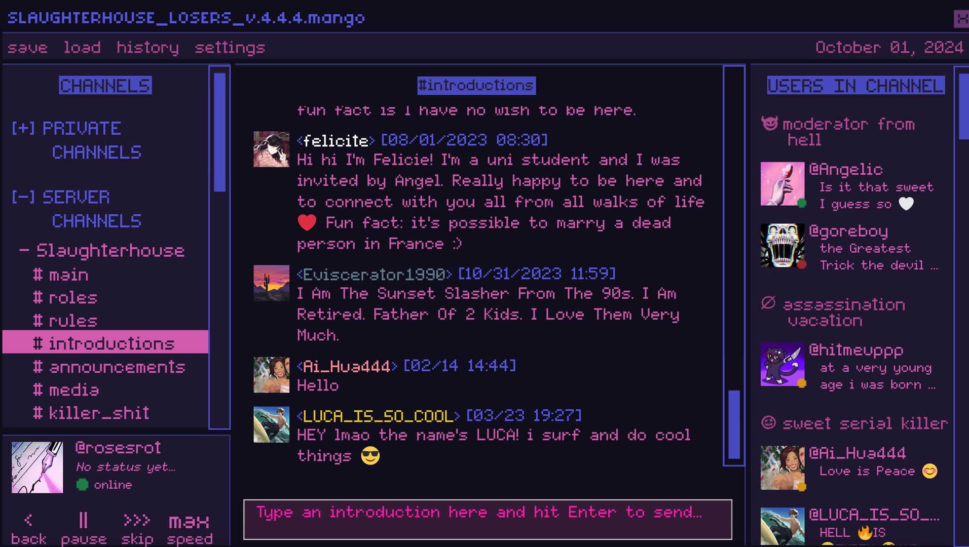 Yup, you heard us right! Killer Chat! is a dark satire romance chatsim where you date serial killers. Pretend to be a serial killer, get inspiration for your book, fall in love, and try not to call the cops through a whirlwind six months with your murderous beau of choice.  Who knows? You might find your happily ever after... or headline the news as a gruesomely lovesick corpse. It's honestly up to you.