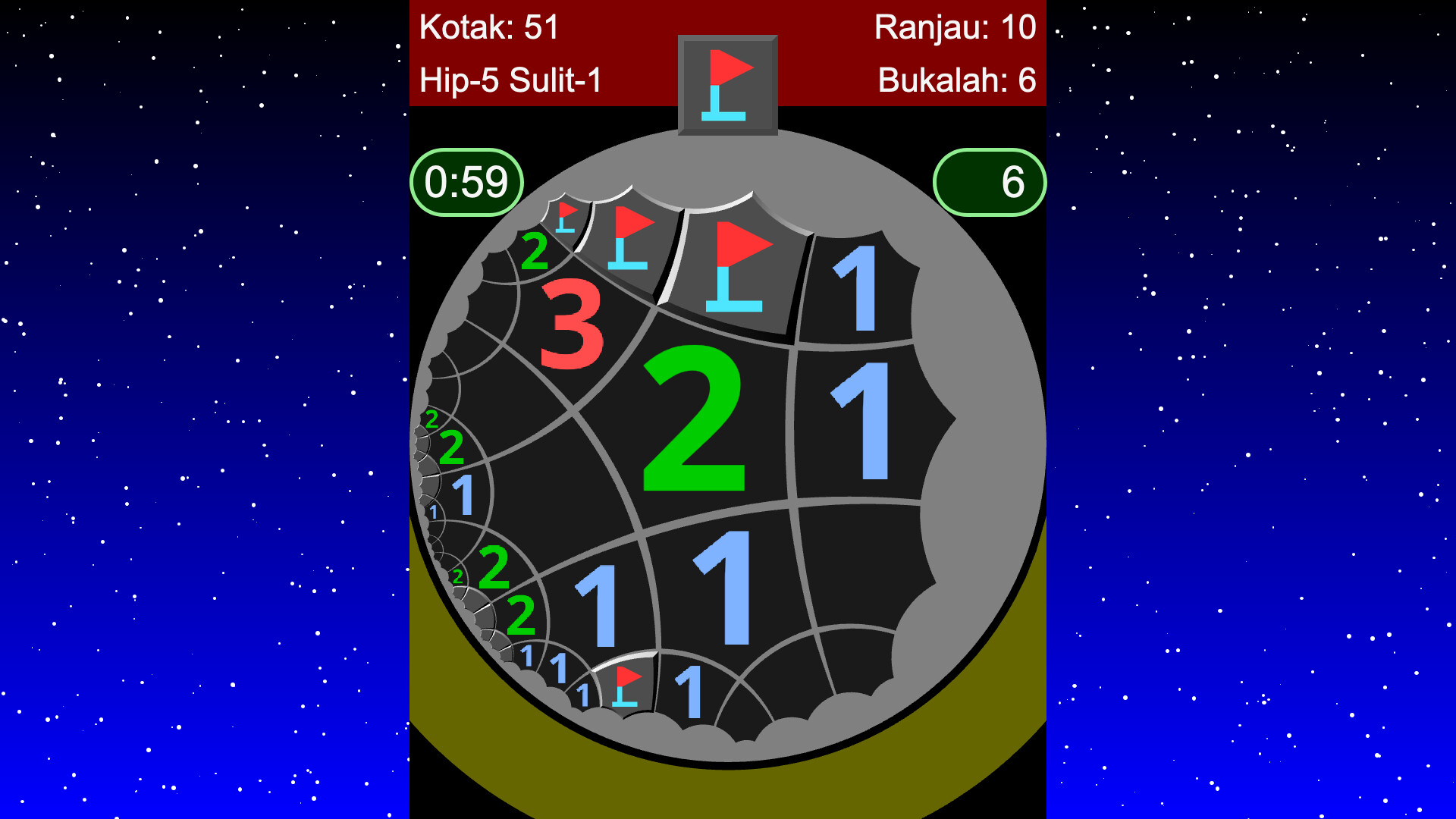 Ini adalah permainan minesweeper geometri non-Euklides yang dapat diselesaikan secara logis tanpa menebak.