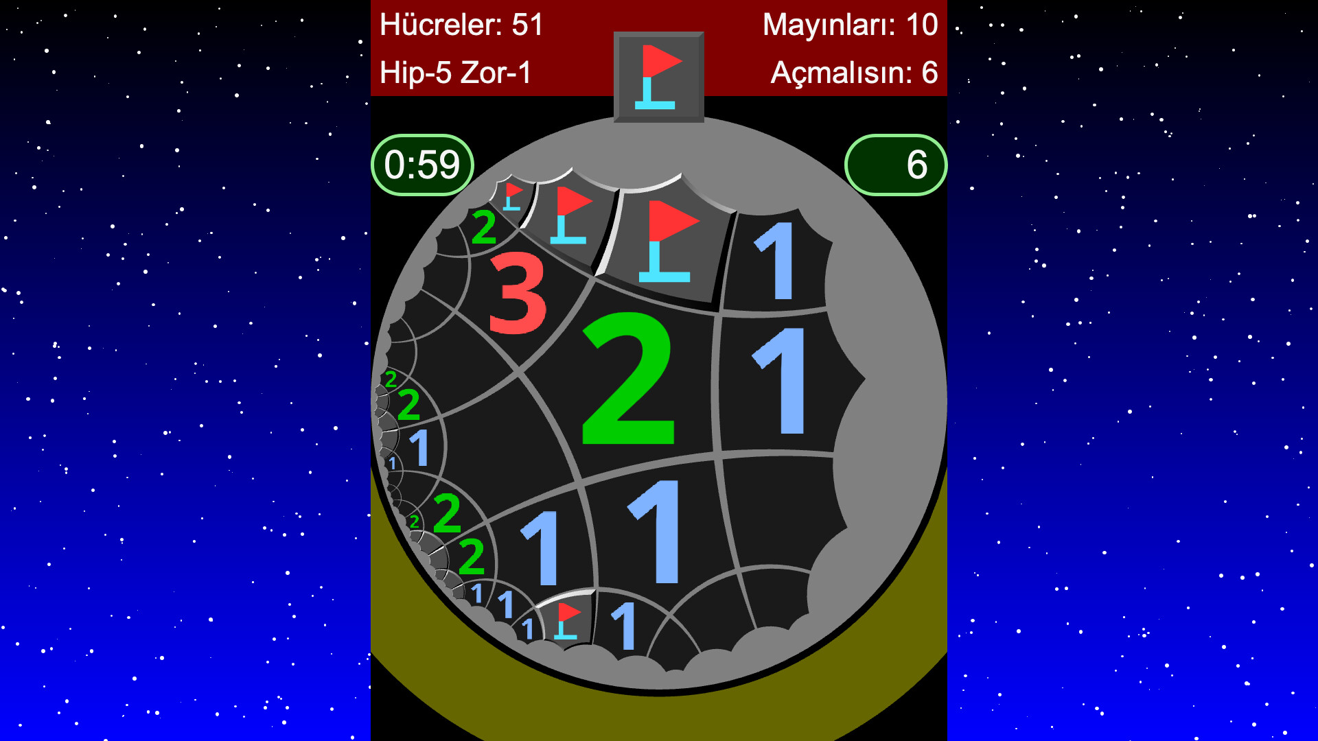 Bu, tahmin yapmadan mantıksal olarak çözülebilen, Öklid dışı geometrik bir mayın tarlası oyunudur.