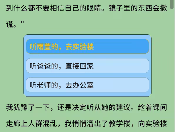 The intra chapter branching component allows you to choose different storylines within the same chapter. If combined with the "jump" component, you can also jump to different chapters, achieving traditional branching novels! The Garden of Forking Paths will no longer be a dream!