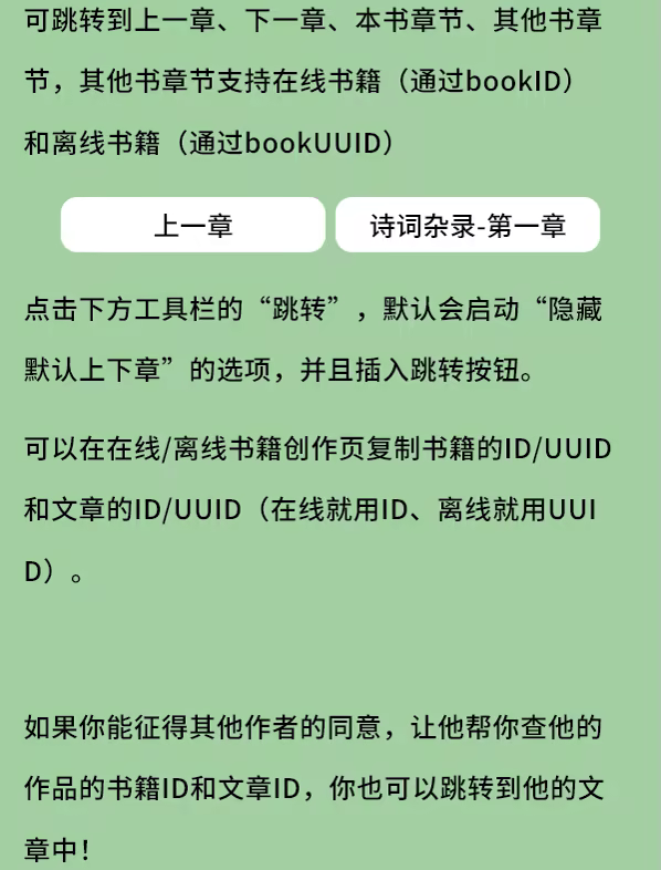 The jump component allows authors to set the desired chapter they want to jump to, which can be from their own book or another book (as long as you have access to its book) ID And articles ID)。 This function is mainly combined with branch components to jointly implement branch novels.
