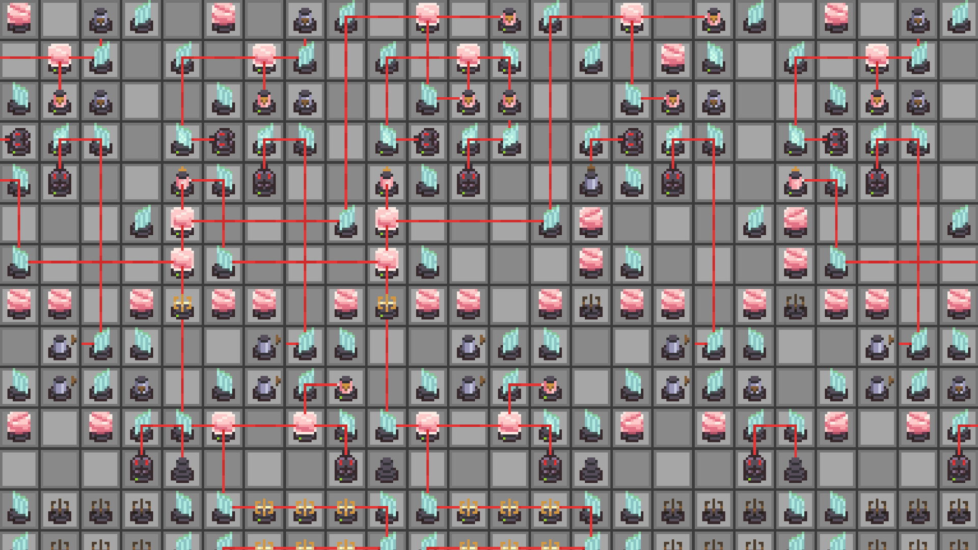 The game also features a sandbox mode where you can build whatever you want. Below is a zoomed in view of an implementation of the one-dimensional elementary cellular automaton Rule 30.