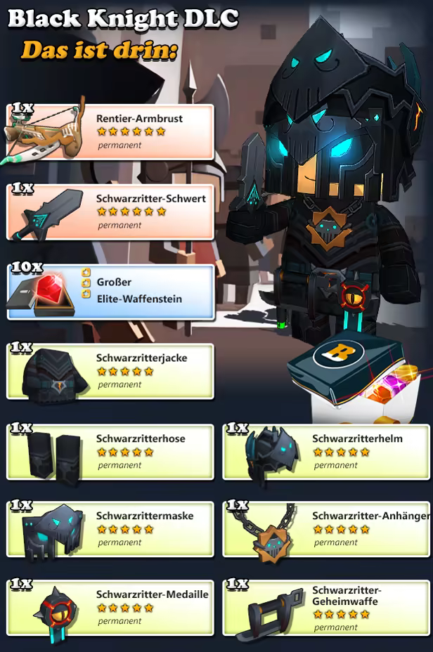 Warum sollte man immer der weiße Ritter sein – schließlich gibt’s ja noch seinen ultracoolen Gegenspieler! Mit dem Schwarzritter-Paket stellt jeder sicher, dass Feinde vor Angst die Beine in die Hand nehmen!