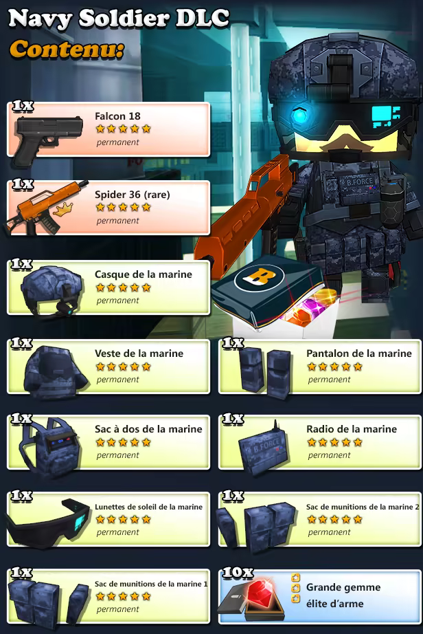 Remarque : à la demande de l'équipe d'édition, Brick-Force: Navy Soldier DLC n'est plus listé sur le magasin Steam et n'apparaitra plus dans les résultats de recherche.