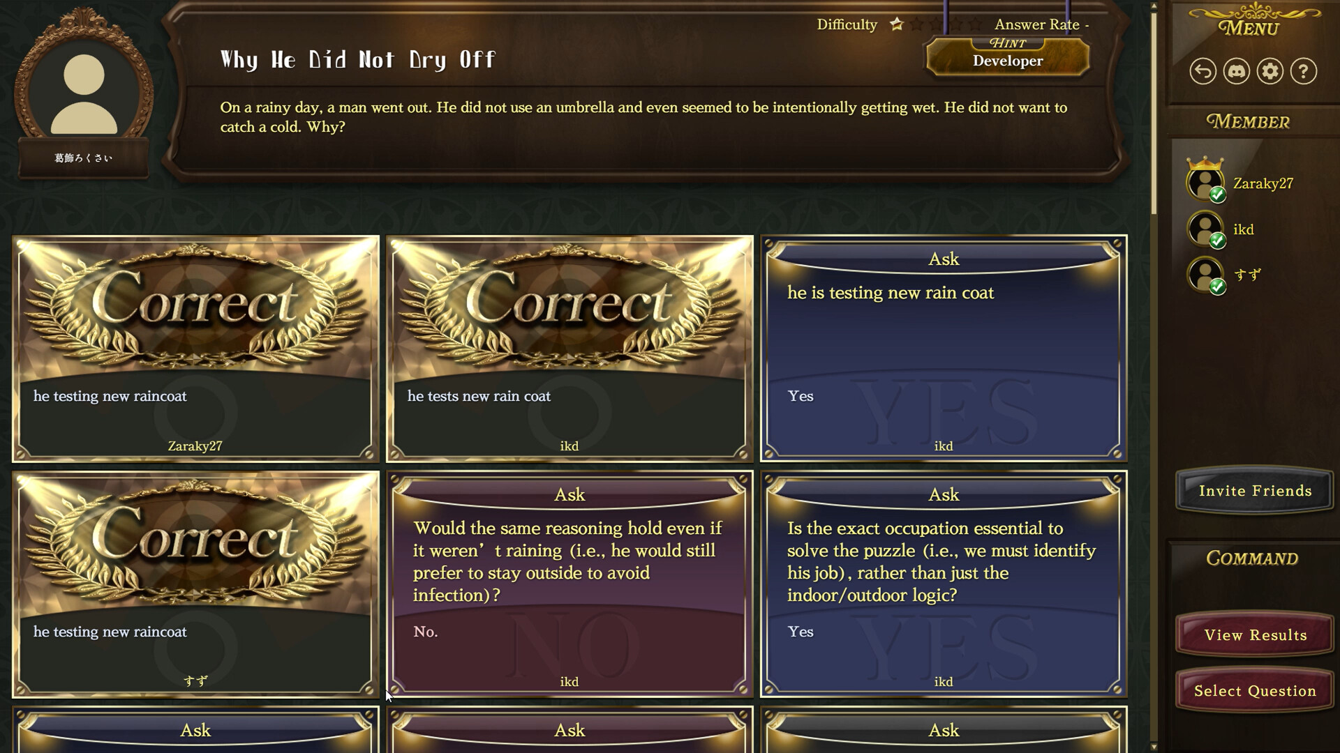 "Lateral Thinking Together" is a cooperative and competitive online multiplayer game that challenges your knowledge and deductive reasoning to uncover the correct answer.