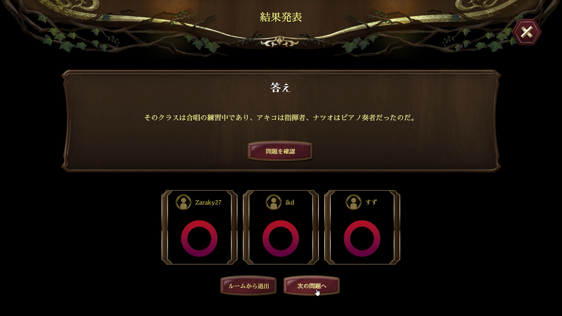 各プレイヤーが個別に質問を投げかけます。質問内容は全員に公開されるので、それを参考に推理を進めましょう。正解がわかったら、解答してください。