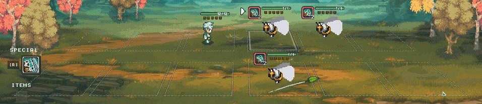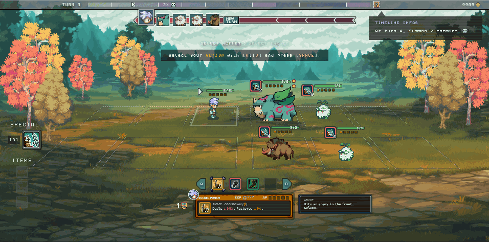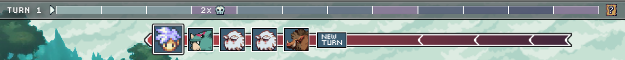 Each battle uses a unique timeline-based system that evolves with each chapter. In Chapter I, for example, a day-night cycle affects the timeline ☀️🌙. New monsters may appear at night, while others may gain new abilities, become enraged, or weaken. Players must manage time and adapt their strategies accordingly.