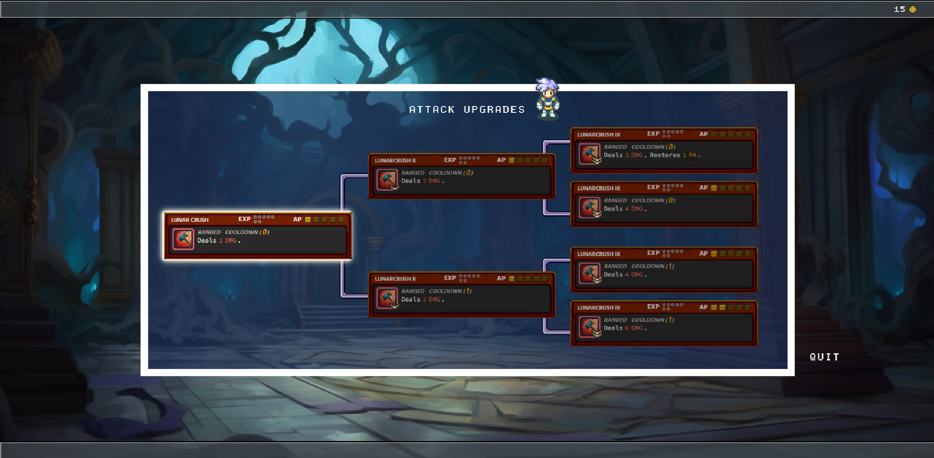 Combat uses an action point system (AP): some attacks consume AP, while others regenerate it. Certain abilities have cooldowns, forcing players to manage resources and timing. Here, it’s not your heroes who level up—it’s their attacks. Each one gains experience and can evolve through different upgrade paths, letting you shape unique builds and strategies.