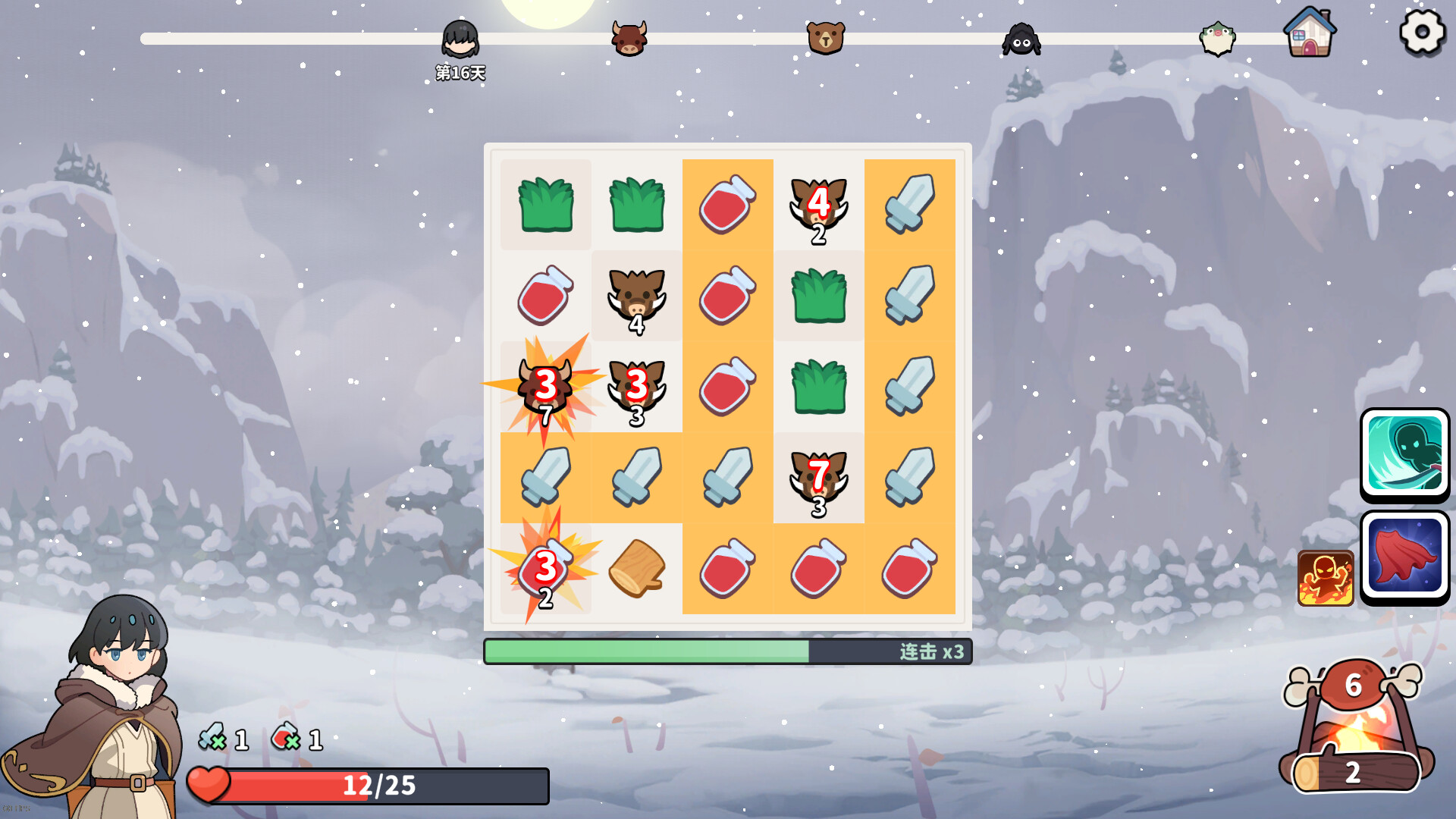 《Winter Hunting》is a RogueLite match-3 game. Matching tile to hunt beasts, gather firewood and grow stronger. Survive for 60 days to win the game!