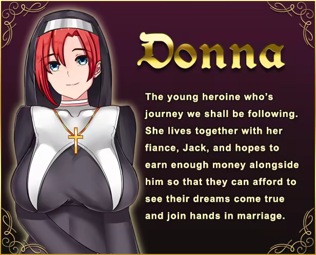 Join Donna, a young wife trying to help her fiance earn enough funds for their wedding. There will be a wide variety of tasks, obstacles, and distractions along the way, but nothing can stand in the way of pure love! Not even a lecherous priest or demons!