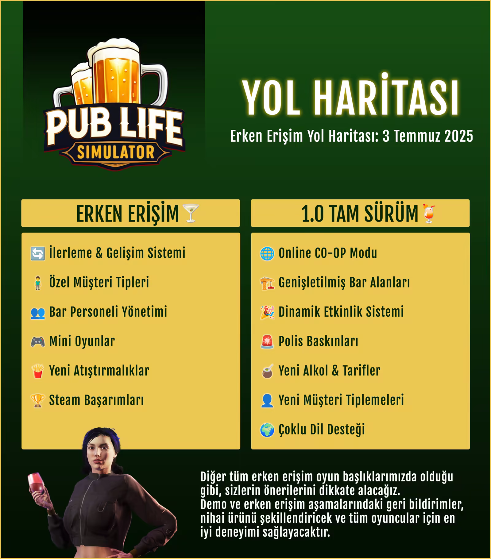 "The Pub Life Simulator'ın yaklaşık 12 ay boyunca Erken Erişim'de kalmasını planlıyoruz. Bu süre, oyuncularımızdan gelen geri bildirimleri toplamak, temel mekanikleri iyileştirmek ve tam sürüm için gerekli ek içerikleri eklemek adına yeterli bir zaman çerçevesi olarak değerlendiriyoruz."