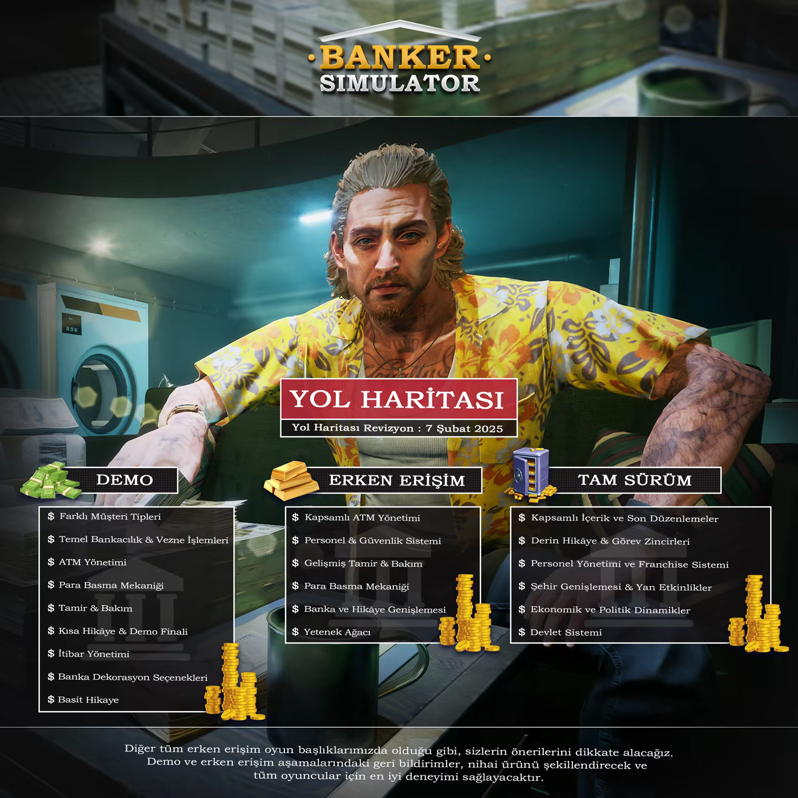 "Simülasyon oyunlarına tutkuyla bağlı bağımsız geliştiriciler olarak, Banker Simulator'ın tam potansiyeline ulaşmasına yardımcı olmak için Erken Erişim'i tercih ettik. Bu hedefe ulaşmanın en iyi yolunun, geliştirme sürecini topluluğumuzla birlikte ilerletmek olduğuna inanıyoruz. Yol haritamızı topluluktan gelen geri bildirimlerle şekillendirmeyi ve oyunun her yönünde oyuncularımızla iş birliği yapmayı dört gözle bekliyoruz."