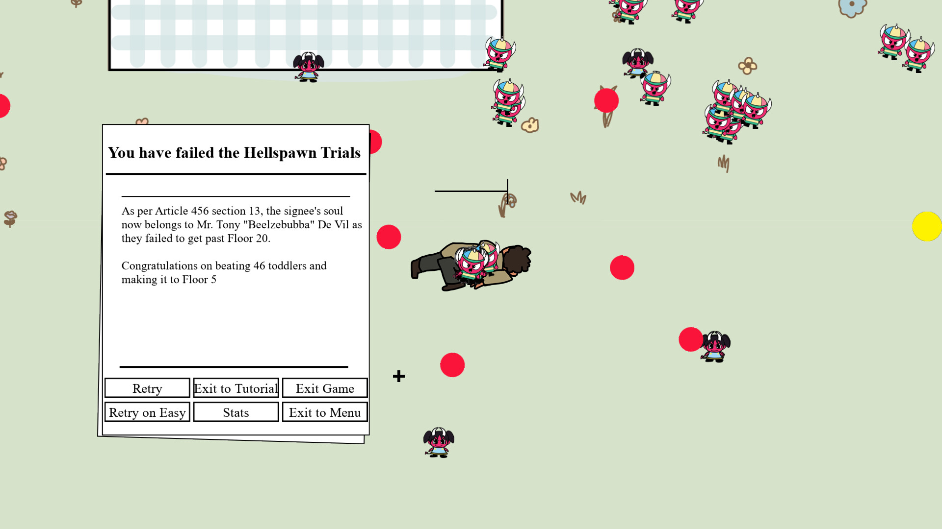 The Hellspawn Trials is an endless top down shooter where you choose from a variety of dynamic weapons and Faustian upgrades with unique side effects so you can become powerful enough to discover the answer to the ultimate question: How many toddlers can you beat in a fight?